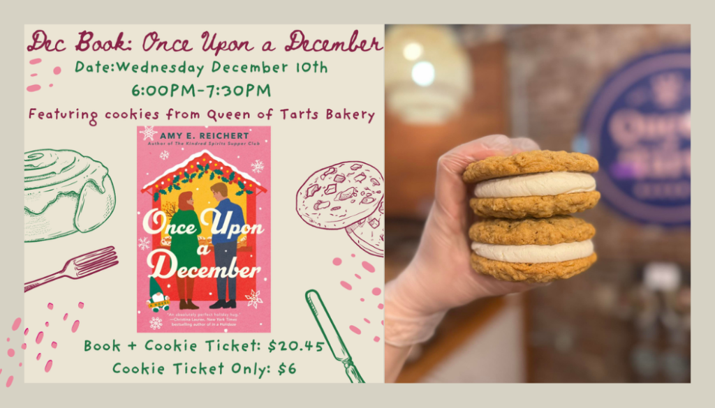 Our December book pick is “Once Upon a December” by Amy E. Reichert, a cozy holiday romcom that feels like a Holiday Hallmark movie in all the best ways. The basic plot: our narrator begins to fall for a handsome baker, who’s bakery just so happens to magically leap from one December to another.